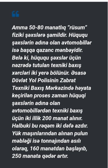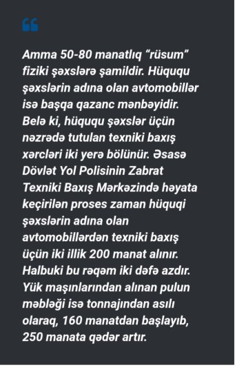 İşin ən maraqlı tərəflərindən biri də odur ki, Dövlət Yol Polisinin Zabrat Texniki Baxış Mərkəzinin rəisi Mərdan Əliyev bu işlərdən əlavə, yeni bir qazanc üsulu da tapıb. Belə ki, texniki baxışa gəlmiş avtomobil tozlu, palçıqlı olarsa, mütləq, elə mərkəzin yaxınlığında fəaliyyət göstərən avtomobil yuma məntəqəsində yuyulmalıdır. Qiymət isə bir maşın üçün 10 manatdır. Əks təqdirdə, maşına texniki baxış həyata keçirilmir.